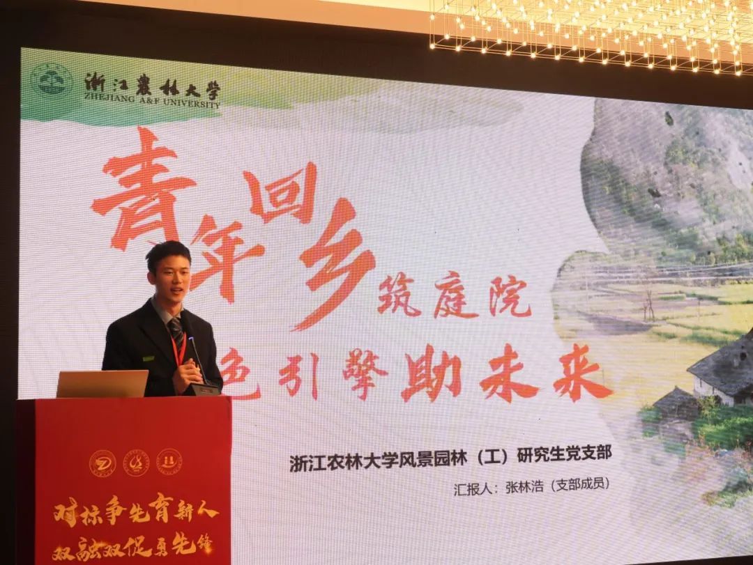 之后,9所高校的研究生样板党支部、研究生党员标兵培育创建单位的13名代表进行交流发言。其中,风景园林(工)研究生党支部代表张林浩以“青年回乡筑庭院,红色引擎助未来”为题,进行了精彩汇报。他展示了在“千万工程”时代背景下,公司在党建引领下取得的一系列实践与育人成果。园林学子充分发挥党员先锋模范作用,在助力乡村振兴过程中利用自身专业知识改善农村人居环境,体现了园林学子在新时代建设和美乡村的使命担当。