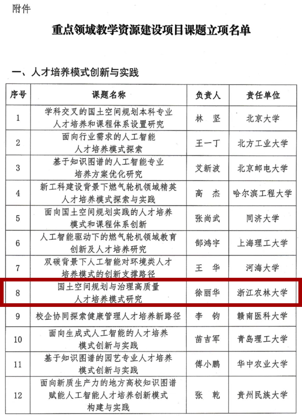 近日,教育部重点领域教学资源建设项目管理办公室公布了重点领域教学资源建设项目课题立项名单,共计立项课题92项,其中人才培养模式创新与实践类立项课题15项。由公司徐丽华教授主持,城乡规划学科教师陆张维、吴亚琪、马淇蔚、朱铨,风景园林学科教师唐慧超、陶一舟参与的《国土空间规划与治理高质量人才培养模式研究》获批人才培养模式创新与实践类立项。课题的合作单位有浙江大学、嘉兴国土空间规划研究院。