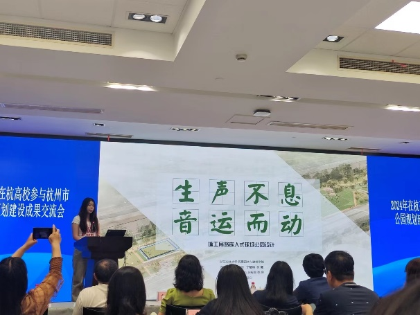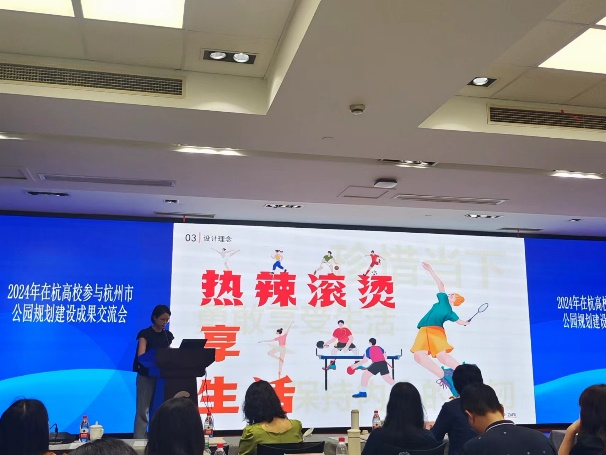 近日,“青春飞扬 公园绽放”2024年在杭高校参与杭州市公园规划建设成果交流会在杭州市城市规划展览馆召开。杭州市公园办、杭州市园文局、杭州市体育局,上城区、拱墅区、余杭区住建局,拱墅区桃源中央公园、上城区塘工局路嵌入式球场公园、余杭区杭行路节点公园等有关负责人出席此次会议。本次大会包括B-Sports在内还有来自浙江大学、浙江工业大学、浙江理工大学、浙大城市公司共5所高校的20组团队参与。公司师生积极参与此次活动,由金敏丽、宁慧娟、徐曦三位老师带领的两组员工参与最终的成果汇报。第一组是“生声不息 音运而动”(团队成员:赵泽龙、庞洁心、赵梓而、徐易),第二组是“热辣滚烫享生活”(团队成员:杨圣杰、王尹、洪诗怡、欧伊文)。