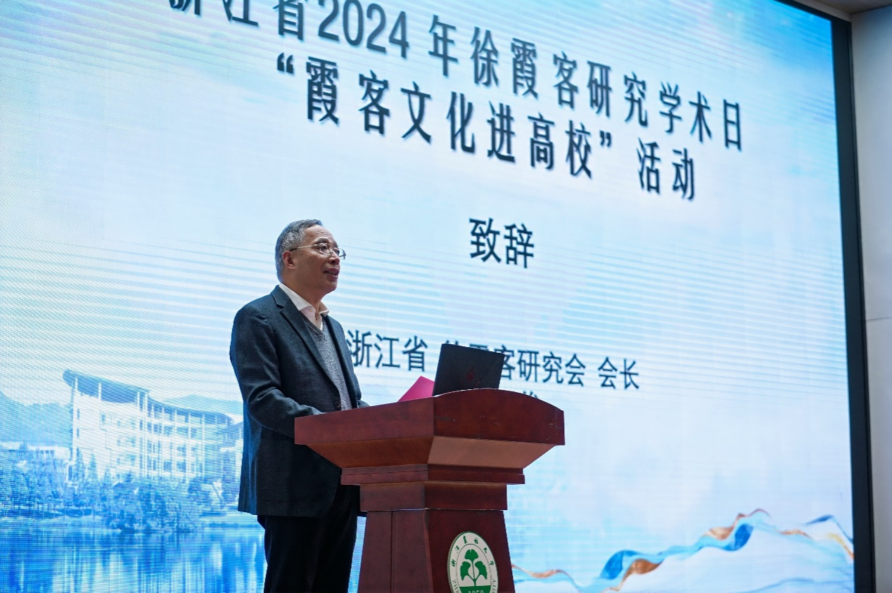 浙江省徐霞客研究会会长潘俊国在致辞中对徐霞客文化学习的重要性以及其与时代进行的内涵进行了相关的阐述。他指出在当今的时代快速发展过程中,注重对于传统文化的传承与发展,研究好霞客历史、讲好霞客故事、传好霞客文化,丰富霞客文化的内涵和时代价值具有重要意义。本次的“霞客文化进校园”活动展开是对传统文化宣传与发展的重要实践,势必将助力社会文化的传承与培养。最后他代表研究会预祝本次学术活动圆满成功。