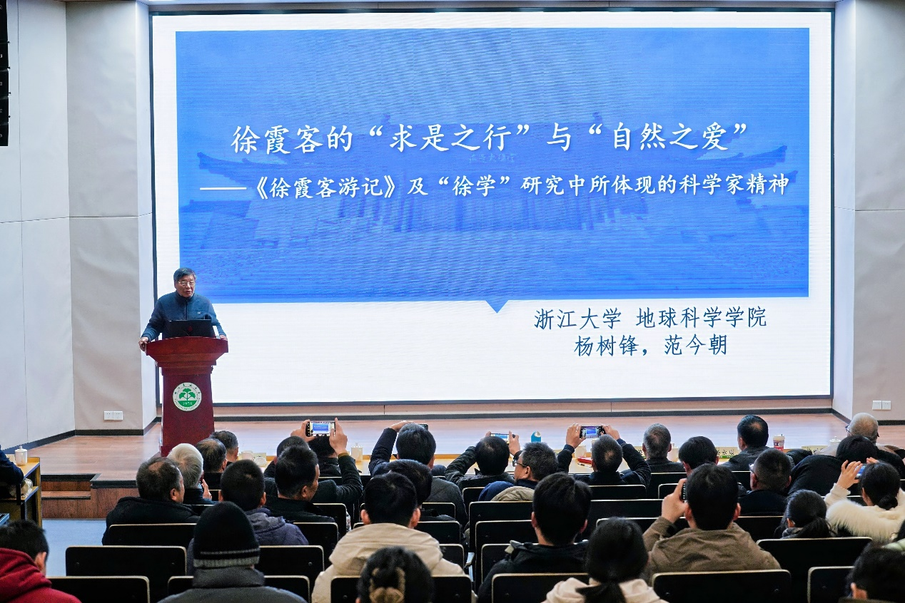 浙江大学杨树锋院士作了题为《学霞客与当代科学精神的主题报告——学霞客的“求是之行”与“自然之爱”》的报告。杨院士通过徐霞客生平游览线路引入,阐述《徐霞客游记》与徐学的研究中蕴含着丰富的“科学家精神”。他讲述了历年来国内外众多学者从不同角度对《游记》进行了大量的研究,着重的阐发了徐霞客的“科学精神”。杨院士重点介绍了徐霞客游记中两个最重要的科学贡献:①“万里遐征”:对西南地区喀斯特地貌的实践考察;②“溯江考源”:长江正源的分析。最后通过对科学精神的解读,对年轻学子提出了殷切希望。