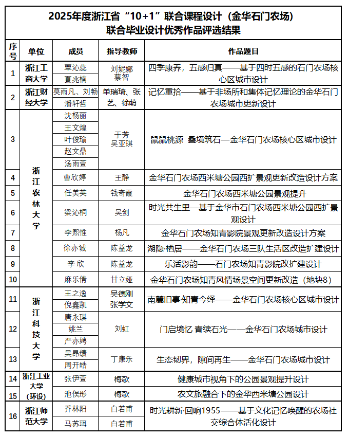 至此,第四届浙江省“10+1”联合课程设计(金华基地)毕业设计答辩会圆满结束。本次活动通过"基地化、竞赛化、协同化"的创新模式,成功搭建了跨院校、跨专业的教学交流平台。此次联合毕业设计活动不仅展现了浙江省高校规划设计教育的丰硕成果,更为创新人才培养模式提供了宝贵经验,必将推动规划设计教育向更高水平发展。