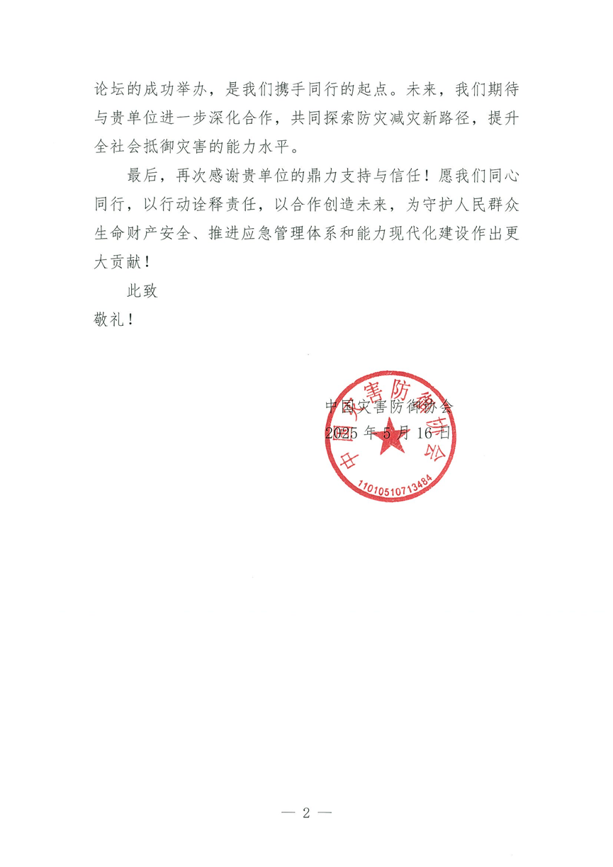 中国灾害防御协会在信中特别指出,此次合作是双方携手同行的新起点。未来,协会期待与公司进一步深化合作,共同探索防灾减灾新路径,推进应急管理体系和能力现代化建设,为守护人民群众生命财产安全凝聚更强合力!