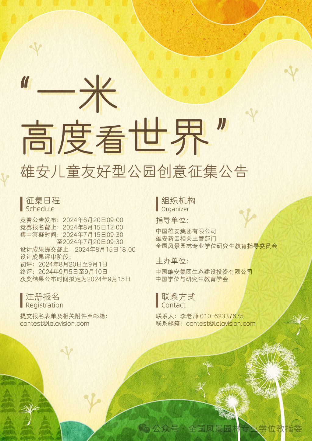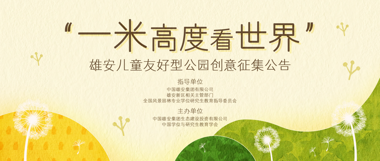 为高质量推进儿童友好城市建设,高标准打造儿童友好示范点,积极探索儿童友好建设的“雄安路径”,由全国风景园林专业学位研究生教育指导委员会指导开展的风景园林专业学位研究生创新设计大赛“一米高度看世界”——雄安儿童友好型公园创意征集活动已正式启动,本次大赛已经获得中国学位与研究生教育学会的中国研究生“美丽中国”创新设计大赛认可。本赛季员工组获奖团队将直接获得中国学位与研究生教育学会作为主办单位的“第二届中国研究生'美丽中国'创新设计大赛”全国决赛入围资格。(赛事详情请登录 https://cpipc.acge.org.cn/)