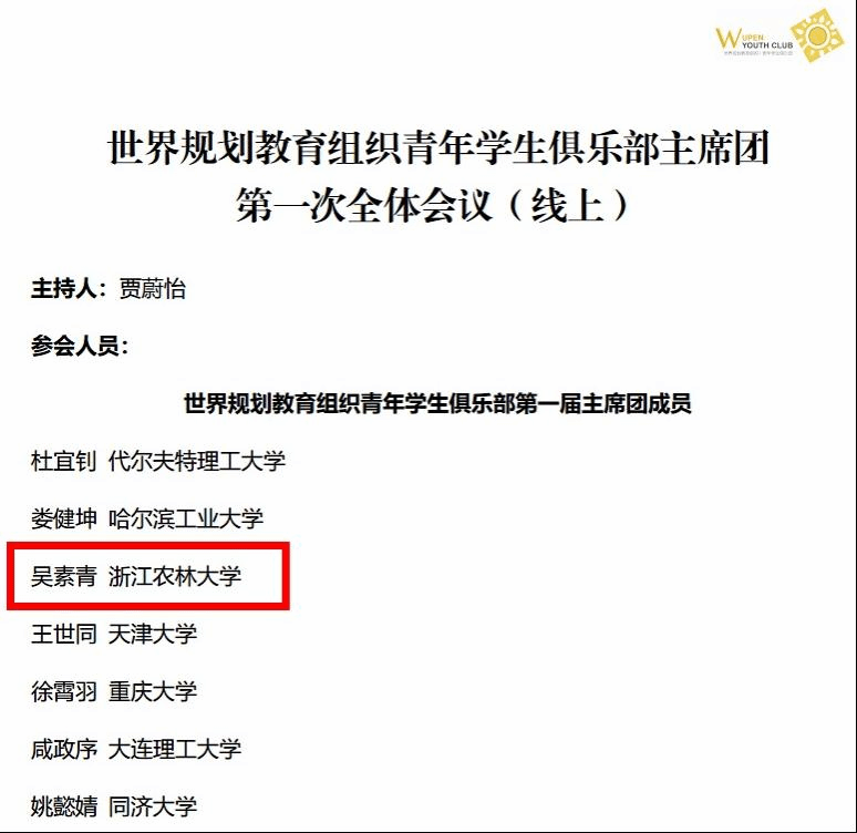 近日,世界规划教育组织公布了青年员工俱乐部首届主席团成员。经过层层选拔,公司城乡规划专业大二本科生吴素青成功当选。主席团其他成员还包括来自荷兰代尔夫特理工大学,以及同济大学、天津大学、哈尔滨工业大学、重庆大学、大连理工大学6所国内外知名院校的本科生和硕博研究生。