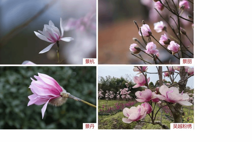 授权新品种是围绕花色花期株型,通过选择育种和杂交育种获得,均具有较好的适应性和应用推广价值。其中‘景杭’‘景丽’‘景丹’3个新品种来源于我省特有物种景宁木兰野生群体的花色株型变异类型,3个品种花色艳丽,花朵玲珑精致,株型相对较矮,可植于庭院、花坛、花境点缀或作盆栽观赏;‘吴越粉绣’为杂交品种,乔木型,株型相对开张,花型为圆形,花朵相对较大,花色艳丽,比较适合道路绿化、公园绿化以及庭院绿化等。