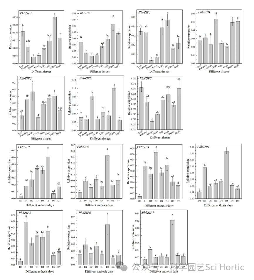 图4 7个候选PhbZIP基因组织特异性表达模式及花发育阶段特异性表达模式