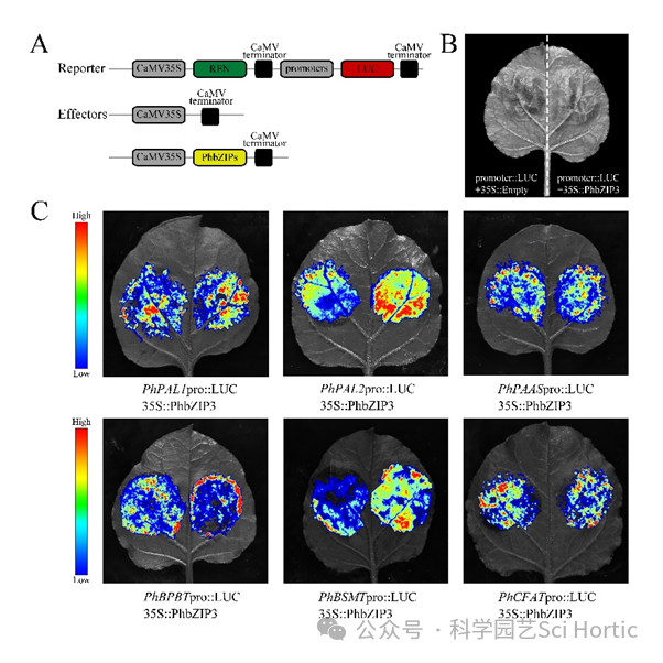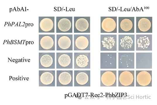为了验证PhbZIP3调控机制,我们分析了矮牵牛FVBP合成通路中代谢基因启动子序列,发现PhPAL1、PhPAL2、PhPAAS、PhBPBT、PhBSMT和PhCFAT基因的启动子上存在bZIP可以结合的元件G-box和ABRE。通过双荧光素酶及酵母单杂交试验表明,PhbZIP3能结合并促进PhPAL2和PhBSMT基因的表达(图6和图7)。