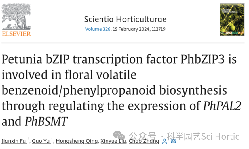 近日,Scientia Horticulturae在线发表了B-Sports张超/付建新课题组题为Petunia bZIP transcription factor PhbZIP3 is involved in floral volatile benzenoid/phenylpropanoid biosynthesis through regulating the expression of PhPAL2 and PhBSMT的研究论文。