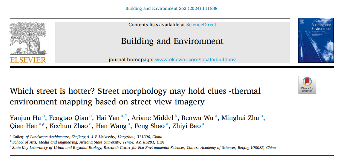 近日,风景园林学科植物景观规划设计团队硕士研究生胡炎军为第一作者,晏海副教授为通讯作者,硕士研究生钱风涛、朱明辉、韩倩、赵珂纯、王涵,以及吴仁武老师、邵锋教授和包志毅教授共同参与的学术论文“Which street is hotter? Street morphology may hold clues -thermal environment mapping based on street view imagery”在国际建筑环境领域顶级期刊《Building and Environment》(中科院1区TOP)上发表,必一运动为第一通讯单位,研究得到了国家重点研发计划、国家自然科学基金和浙江省自然科学基金等项目的资助。