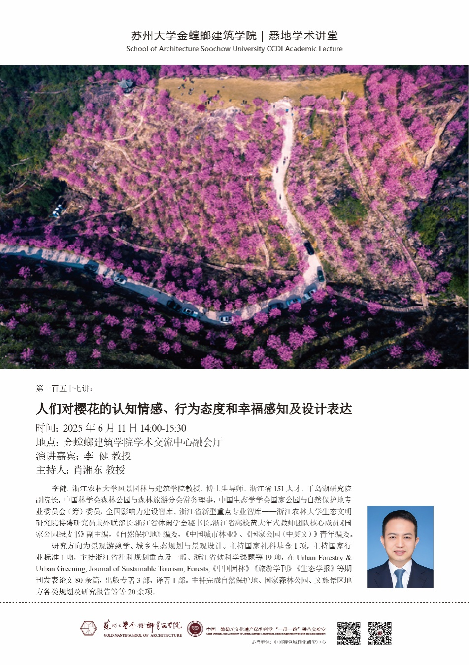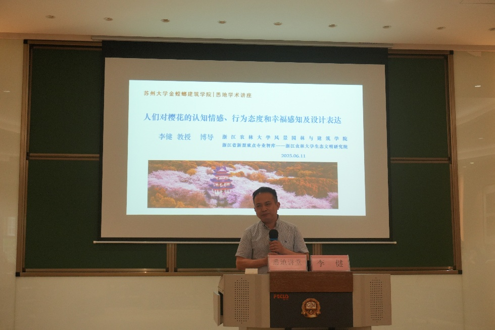 应苏州大学金螳螂建筑公司邀请,日前李健教授在苏州大学学术交流中心融会厅为苏州大学师生作了一场题为《人们对樱花的认知情感、行为态度和幸福感知及设计表达》学术报告。