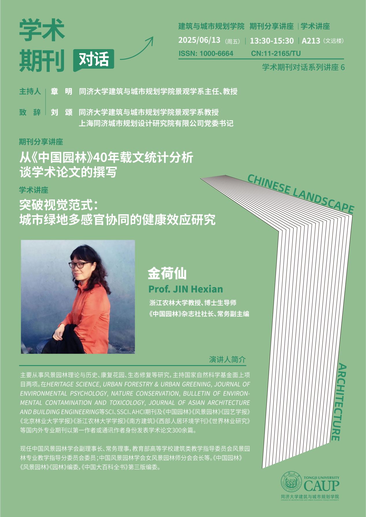 应同济大学建筑与城市规划公司邀请,日前《中国园林》杂志社社长、公司金荷仙教授在同济大学文远楼,为同济大学师生带来一场聚焦学术期刊发展以及城市绿地健康效应的对话讲座。