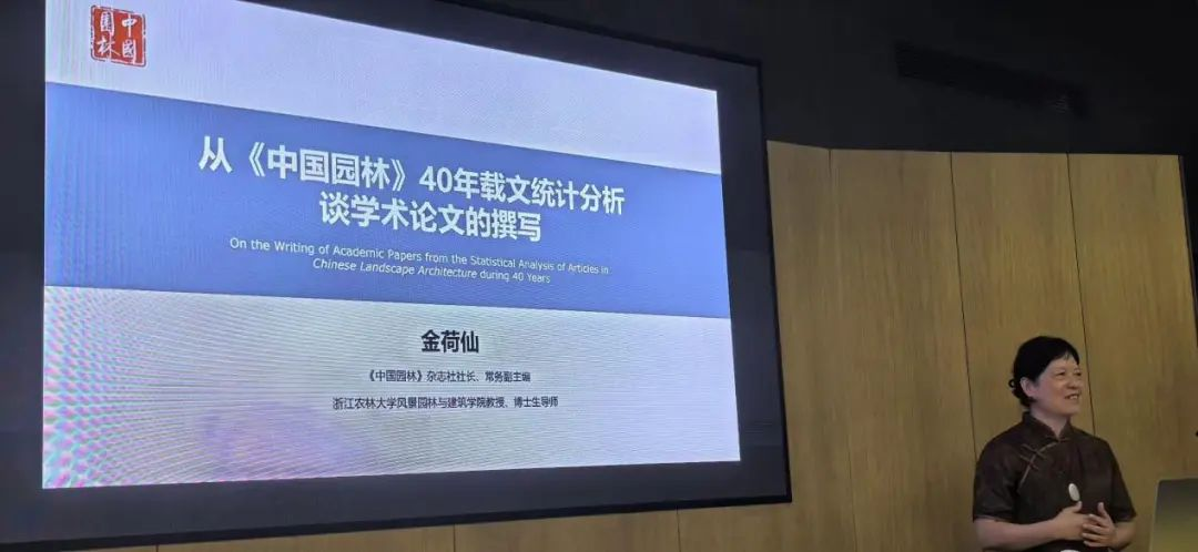 金荷仙教授的讲座以“从《中国园林》40年载文统计分析谈学术论文的撰写”为主题,深入剖析了《中国园林》作为核心学术期刊的影响力及其在风景园林学科发展中的重要作用。她结合期刊40年的载文数据,详细解读了论文选题、基金资助、作者分布、合作网络以及研究热点与趋势,并分享了优秀论文应具备的创新性、规范性、科学性等核心特征,并就高质量论文撰写、审稿意见回应及退稿应对策略给出建议,为青年学者提供了极具价值的写作指导。