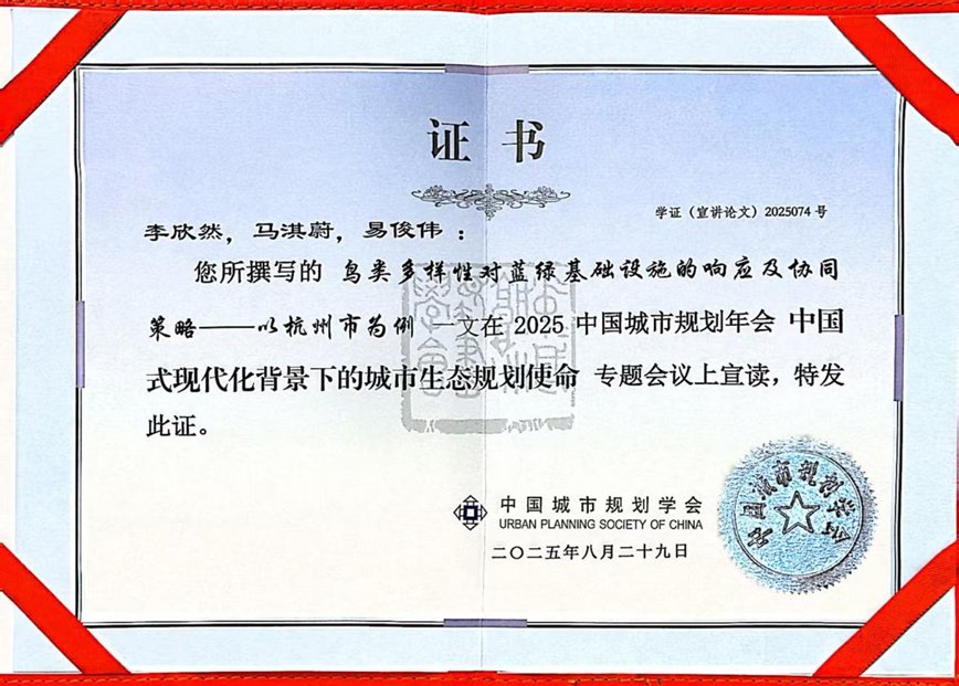 由公司城乡规划学学科马淇蔚副教授以及研究生李欣然、易俊伟共同撰写的《鸟类多样性对蓝绿基础设施的响应及协同策略——以杭州市为例》一文从3766篇投稿论文中脱颖而出,被遴选为优秀宣讲论文,并在“中国式现代化背景下的城市生态规划使命”专题会议上作了学术报告。报告紧扣城市生物多样性议题,提出了鸟类生境保护与城市蓝绿空间高质量发展的协同目标,引起与会人员强烈反响。