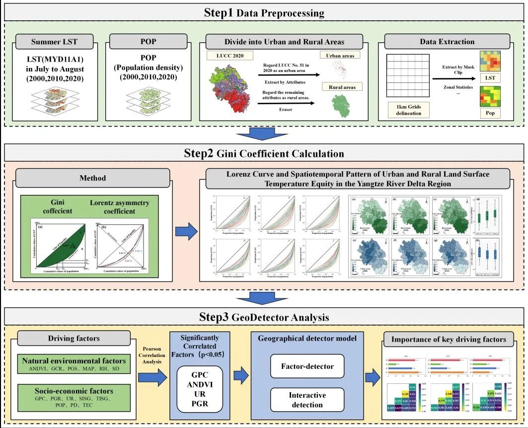 该研究聚焦长三角地区2000-2020年城乡人口热暴露差异,采用基尼系数与洛伦兹不对称系数结合的方法,量化城乡地表温度暴露的不平等程度,并通过地理探测器模型识别关键驱动因素。