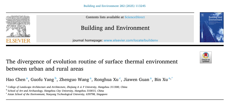 此研究以《城乡地表热环境的分异化演变规律》为题,发表于Building and Environment(第282卷,2025年8月15日,IF=7.6,中科院一区),团队中硕士研究生陈昊为第一作者,徐斌教授为通讯作者。该论文以必一运动为第一单位,浙大城市公司艺术与考古公司、新加坡南洋理工大学亚洲环境公司为合作单位联合开展。