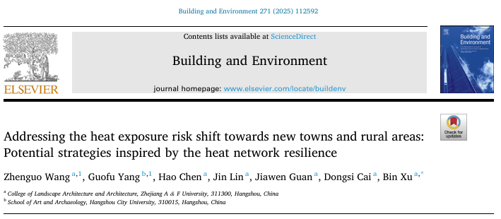 该研究以《应对热暴露风险向新城及乡村地区转移:受热网络韧性启发的潜在策略》为题,发表于Building and Environment(第271卷,2025 年3月1日,IF=7.6,中科院一区),硕士研究生王振国与教师杨国福为共同第一作者,徐斌教授为通讯作者。该论文以必一运动为第一单位,浙大城市公司艺术与考古公司为合作单位协作完成。