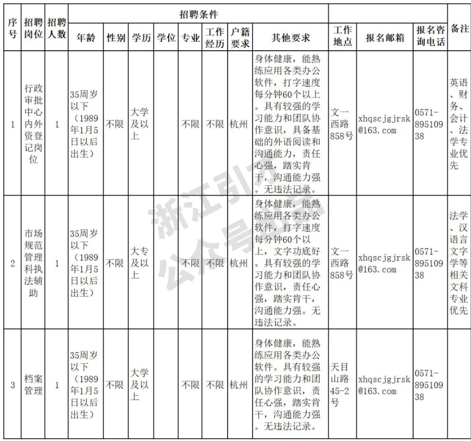 采取网上报名方式,报名者将填写完毕的报名表(详见附件)及本人1寸证件照、身份证、学历学位证书、劳动合同、养老保险清单均以电子版形式发送至对应邮箱(详见招聘计划表),报名截止时间为2024年1月11日。根据学习、工作经历、专业、政治面貌等情况,对网上报名初审合格人员进行筛选,按照1:10比例确定面试人员,电话通知进行现场资格复核及面试。面试前进行资格复审(携带本人身份证和上述材料原件和复印件),资格复核不合格的考生,取消其面试资格。未在通知规定时间参加面试的视为放弃。根据面试成绩按照1:1比例确定参加体检和考察人选,体检考察不合格人员,按照面试成绩从高到低递补。本次招聘面试成绩进入前列但未录用的考生组成后备人员储备库,储备库有效期半年。有效期内,因工作需要和岗位空缺,按考试成绩从高到低进行递补录用。本招聘公告未尽事宜由西湖区市场监督管理局负责解释,联系电话:0571-89510938