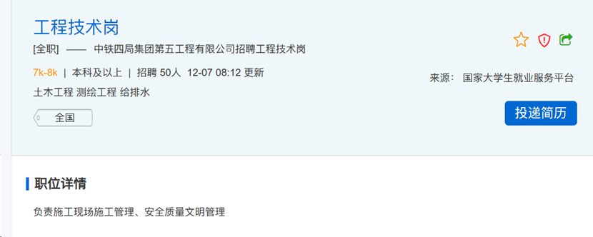 工程技术岗:土木工程类,包括工程力学、铁道工程、道路桥梁与渡河工桥、城市地下空间工程、地质工程、给排水科学与工程、水利水电工程、测绘工程、环境工程、电气工程及其自动化、建筑环境与能源应用工程等专业;