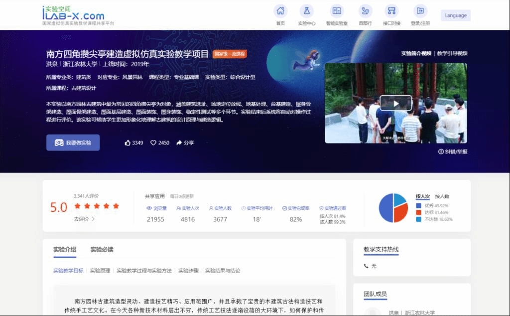 《古建筑设计》是我国建筑学、风景园林等专业本科教学的重要内容。然而,由于古建筑构件种类繁多、安装过程复杂,在课堂教学中无法充分展示其建造过程;在实地调研中,由于古建筑安装结束后,很多构件被隐藏,员工难见全貌;同时,受场地和教学资源所限,许多公司尚不具备制作或展示实体型的条件,员工更无法独立进行建造操作。为解决这一教学难题,课程团队借助3D仿真技术、多媒体技术和网络技术,以南方园林古建筑中最为常见的四角攒尖亭为对象,设计3课时的仿真建造实验,涵盖建筑选址、场地定位放线、地基处理、台基建造、屋身骨架建造、屋面骨架建造、屋面基层建造、屋面装饰、屋身装饰等多个环节。本项目的开放运行依托开放式虚拟仿真实验教学管理平台,集仿真建造、智能指导、结果验证、自动批改和教学管理于一体,具有良好的自主性、交互性和可扩展性。通过本实验,员工可以形象化地理解古建筑设计原理与建造逻辑,实现“以点带面”的学习效果,并在交互操作中激发学习兴趣和对传统技艺的热爱、同时增强空间想象力和实践动手能力。本项目已在国家虚拟仿真实验教学课程共享平台运行多年,累计浏览量超2万次、实验人次近5000,获得广泛好评。