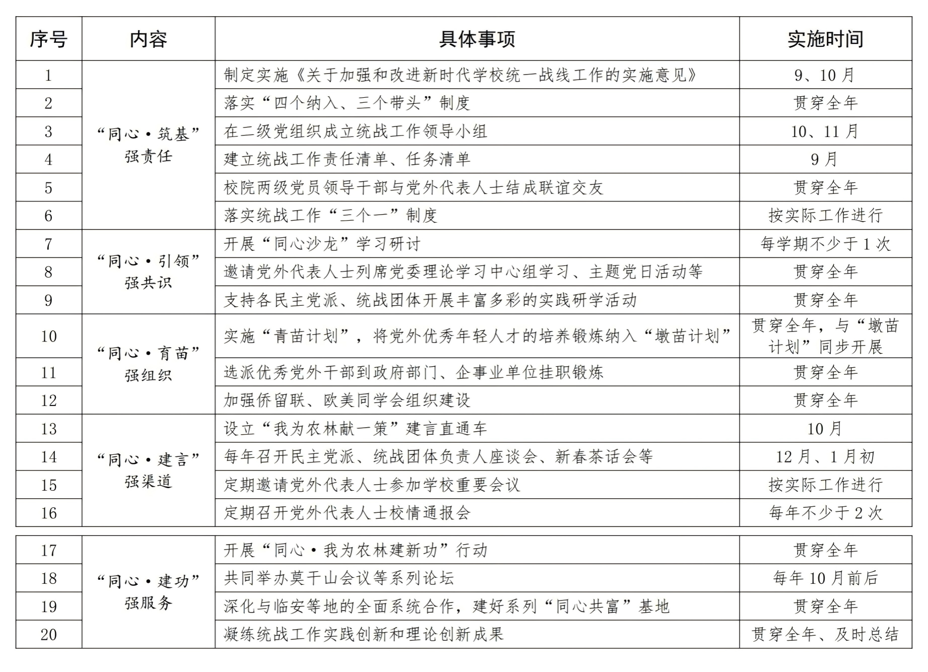 (二)注重工作实效。各党委(总支)要结合实际制定具体方案,从严做好“规定动作”,创新开展“自选动作”,把统一战线工作与贯彻落实中央及省委决策部署结合起来,同本部门、单位的重点工作结合起来,找准切入点和着力点。