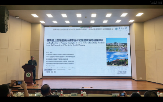 天津大学的陈天教授从背景、理论、策略三个方面介绍入手,首先提出国土空间规划中对水生态的重视,要将水生态系统的规划衔接到国土空间规划体系。在城市规划中,适水性作为一种空间规划和建设理念,强调在城市建设过程中关注城市与水环境系统之间的耦合互相反馈关系。接着介绍了适水韧性的相关研究,从区域层面、城市层面、城区层面和街区层面分别介绍水韧性的建设实践案例,同时结合其团队近年来对天津市城镇空间规模进行模拟,探讨了不同尺度下的适水性规划建设。