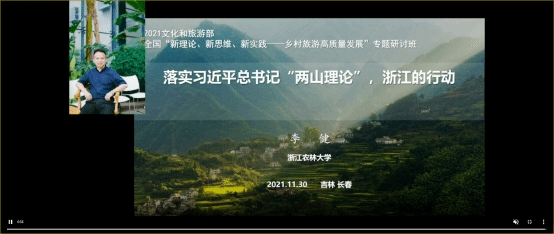 为深入贯彻落实习近平总书记发展文化和旅游的系列讲话精神,落实《中华人民共和国乡村振兴促进法》、《乡村振兴战略规划 2018-2022)》、《关于促进乡村旅游可持续发展的指导意见》,研判乡村文化和旅游发展面临的新形势、新任务,交流发达地区发展的新经验、新模式,探索研讨文化赋能、旅游激活,促进乡村振兴的新问题、新路径。11月30日—12月3日,国家文化和旅游部主办的“新理论、新思维、新实践——乡村旅游高质量发展” 专题研讨班在吉林培训基地成功举办。公司城乡规划学科李健副教授应邀在线为培训班进行《落实习近平总书记“两山理论”,浙江的行动》首场授课。